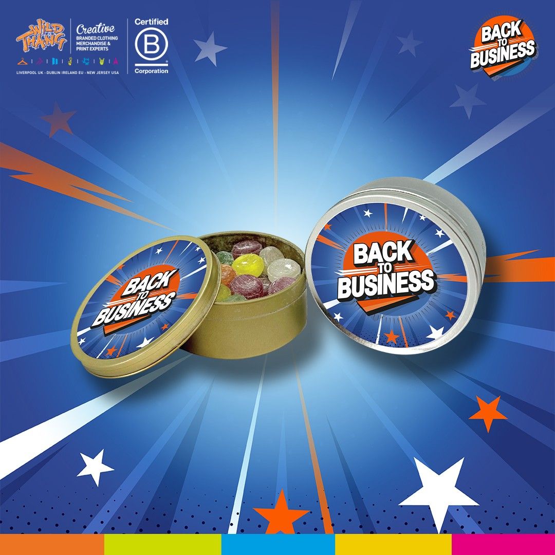 Classic tin with assorted fruit drops, personalised with full-colour top label. Colours and flavours include Red/Strawberry, Blue/Blueberry, Green/Apple, Yellow/Lemon, Orange/Mandarin, Pink/Cherry.