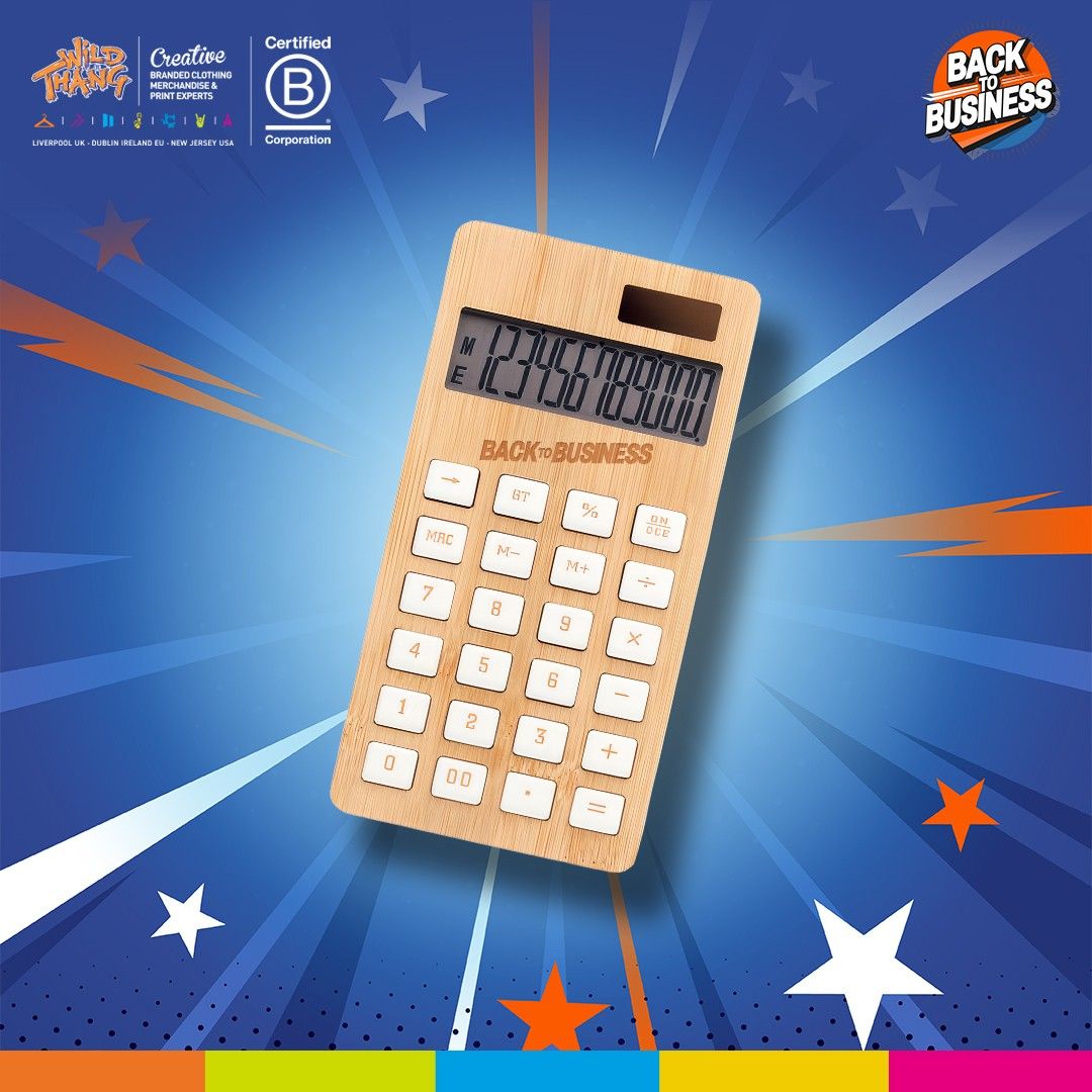 12-digit calculator with dual power in ABS with a bamboo wooden case. Dual powered by solar panel and battery (1 cell LR1131 included). A stylish and practical office essential, perfect for corporate gifting with a natural, eco-friendly aesthetic.