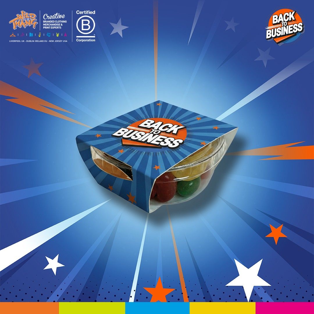 Crystal-clear promotional confectionery tub made from 100% renewable plant starches. Fully compostable and biodegradable, ideal for corporate giveaways, trade shows, or direct mail campaigns.