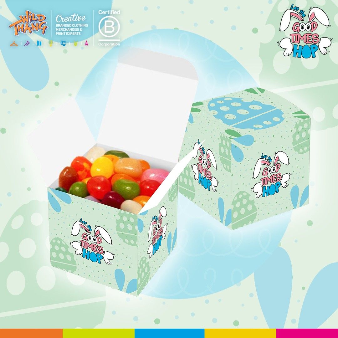 A colourful cube filled with delicious Jelly Bean Factory treats, perfect for adding a playful Easter themed touch to your promotions. The cube offers multiple branding surfaces using high definition digital printing, ensuring your logo or message stands out from every angle.