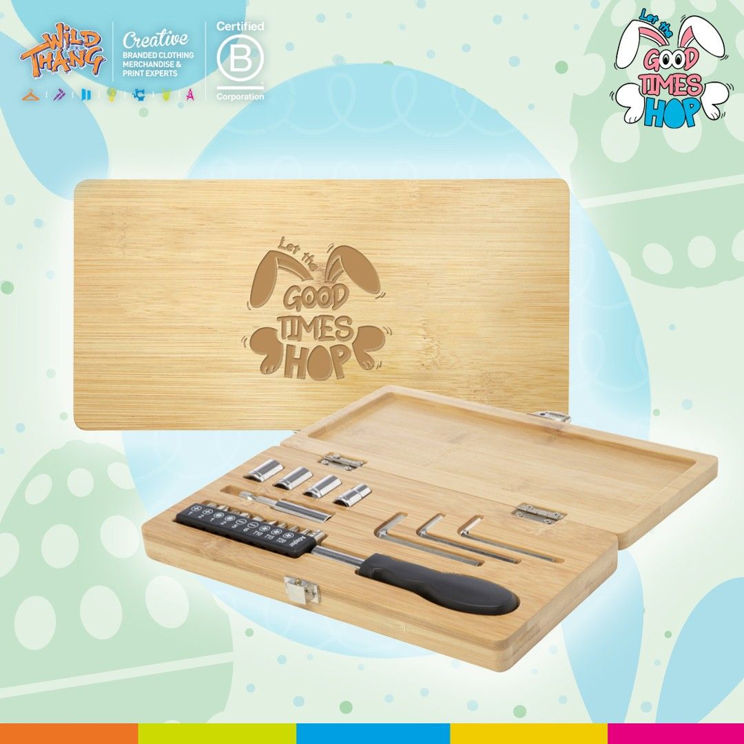 This compact tool set blends functionality with a stylish bamboo and recycled plastic design. Ideal for home, office or travel use, it offers practical everyday tools presented in an attractive case with a natural lower-eco impact aesthetic. A thoughtful branded gift that combines usefulness with responsible design.