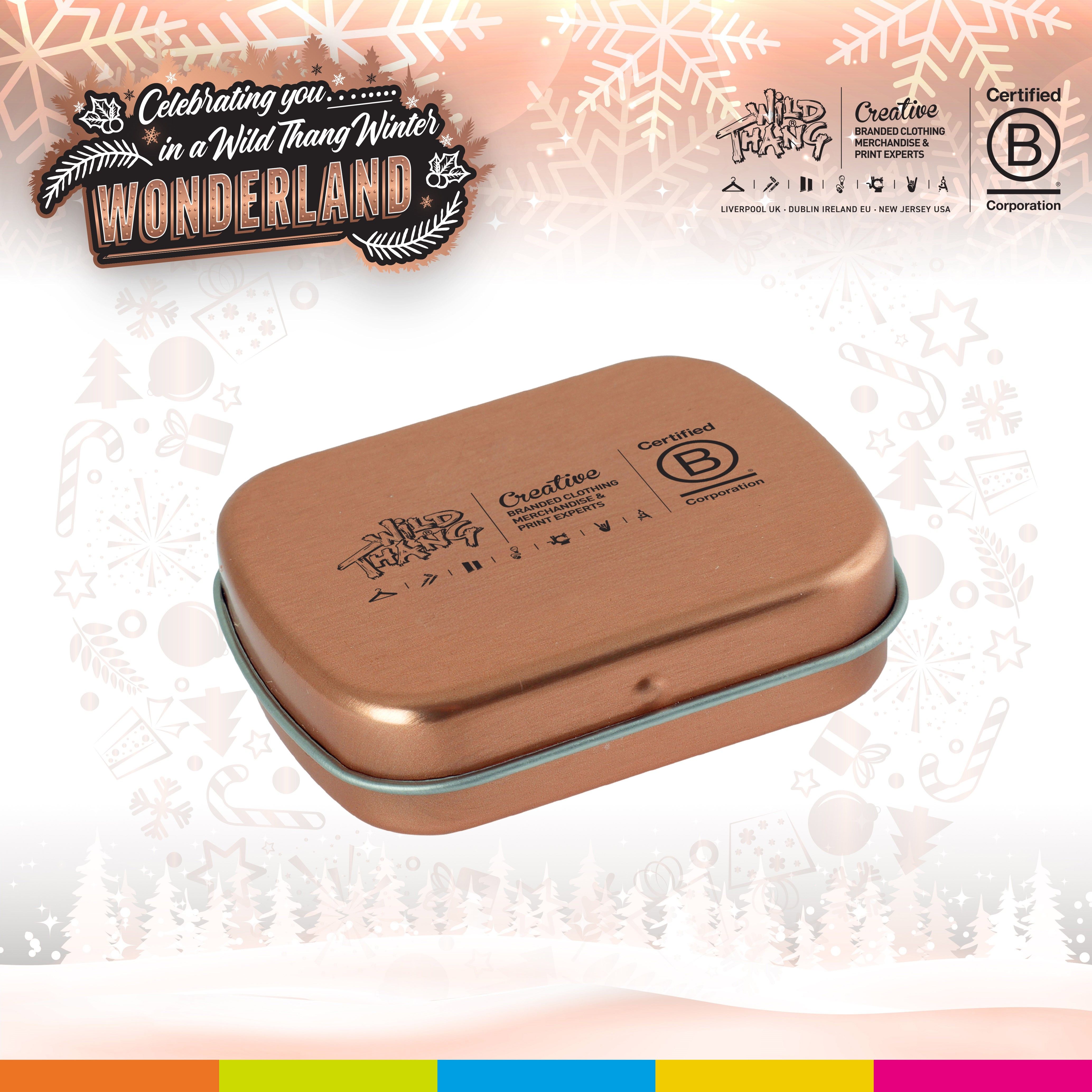 Tin With Dextrose MintsA reusable, durable tin packed with refreshing mints, perfect for festive gifting and reducing waste. Compact enough for any pocket, ideal for freshening up during the busy holiday season.