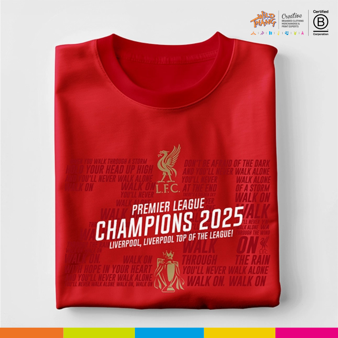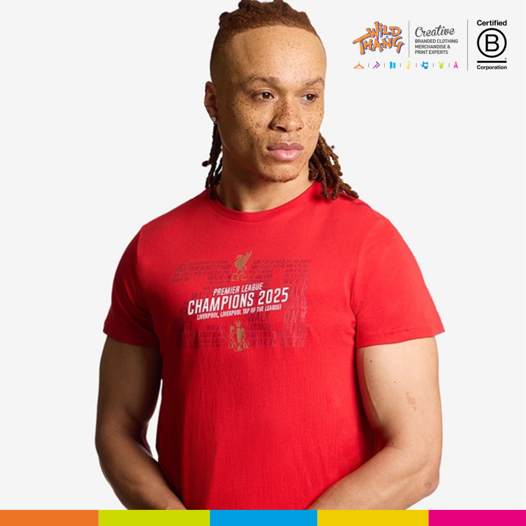 LFC Champions T Shirt In ActionIt’s all about trust, and why Wild Thang? We believe that every organisation should ask the important “why?” question before choosing a branding partner, ensuring their suppliers share the same values, ethical standards, and sustainability goals. Partnering with Wild Thang means aligning with a company that puts integrity, transparency, and accountability at the forefront. Our team works tirelessly to protect our clients’ brand reputation, reduce supply chain risk, and provide measurable ESG impact. For every order received, we will even be planting trees and investing in carbon reduction projects. This commitment ensures that every partnership we build not only delivers exceptional results and products but also contributes positively to people, the planet, and the wider community.